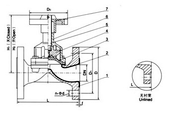 Parts list: 1. valve body 2. valve body lining 3. diaphragm 4. disc 5. stem 6. valve cover 7 hand wheel.