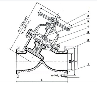 Parts list: 1, body 2, valve body lining 3, diaphragm 4, disc 5, stem 6, valve cap 7, handwheel.