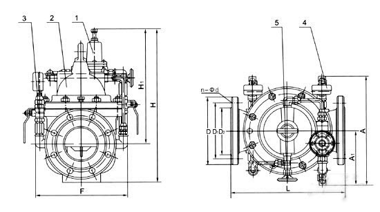 1、導閥2、主閥3、球閥4、壓力表5、針表